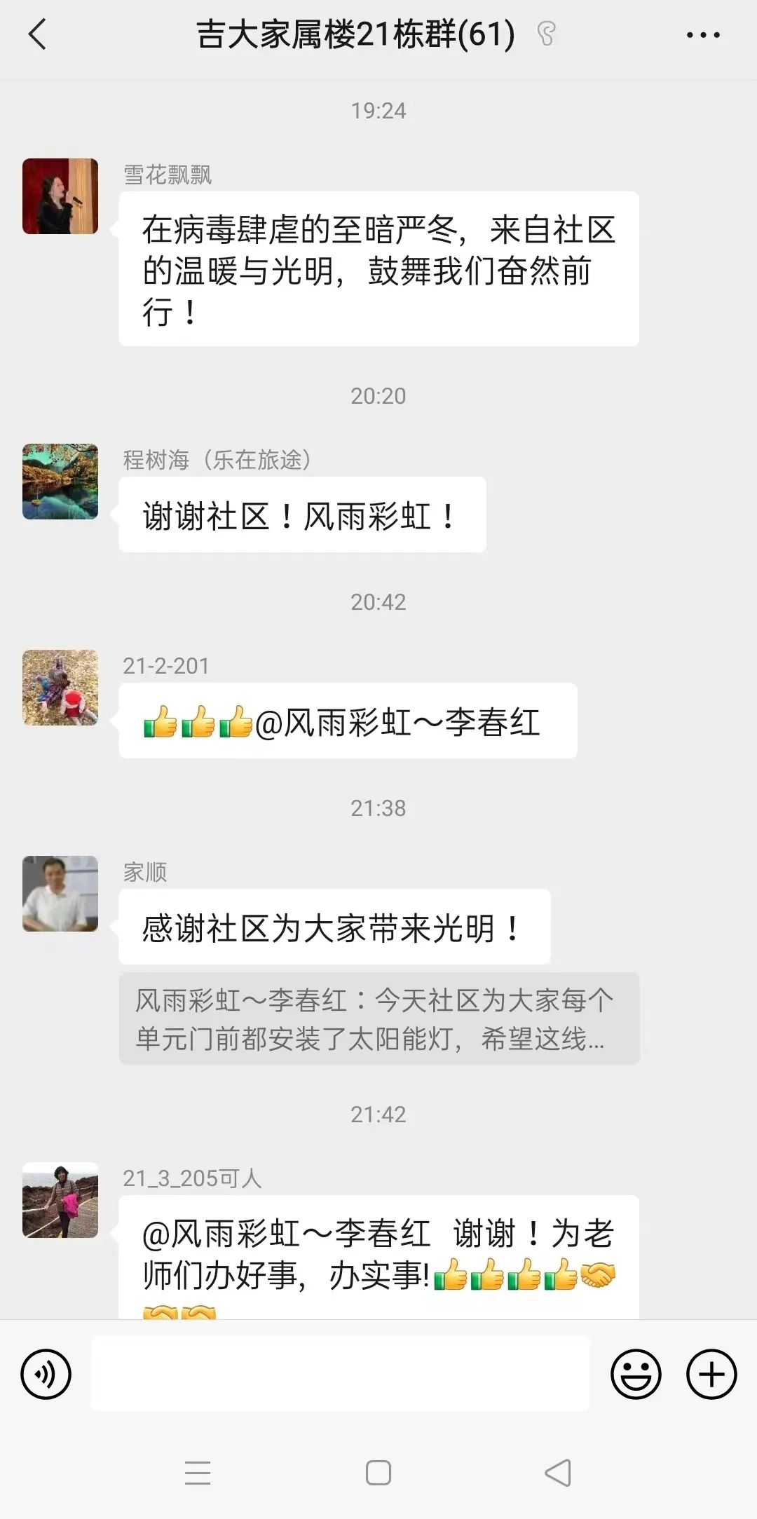 吉大家属区属于老旧小区,基础设施破损严重。多年来,小区单元门前一直未安装照明设备,居民夜间出行不方便,存在安全隐患,大家都期盼着能早日装上照明灯,点亮回家的路。吉大社区共建单位——吉林省委政研室、吉林省公务员录用考试中心以及吉大商座党支部在了解到居民们的“微心愿”后,主动认领。通过现场勘查研究后,共为吉大家属区145个单元购买了节能、环保的太阳能LED灯。社区动员“三长”、志愿者一起动手,于近日全部安装完毕,满足了小区居民的“微心愿”。居民在楼栋微信群感慨到:“在病毒肆虐的至暗寒冬,来自社区的温暖与光明,鼓舞我们奋然前行!”