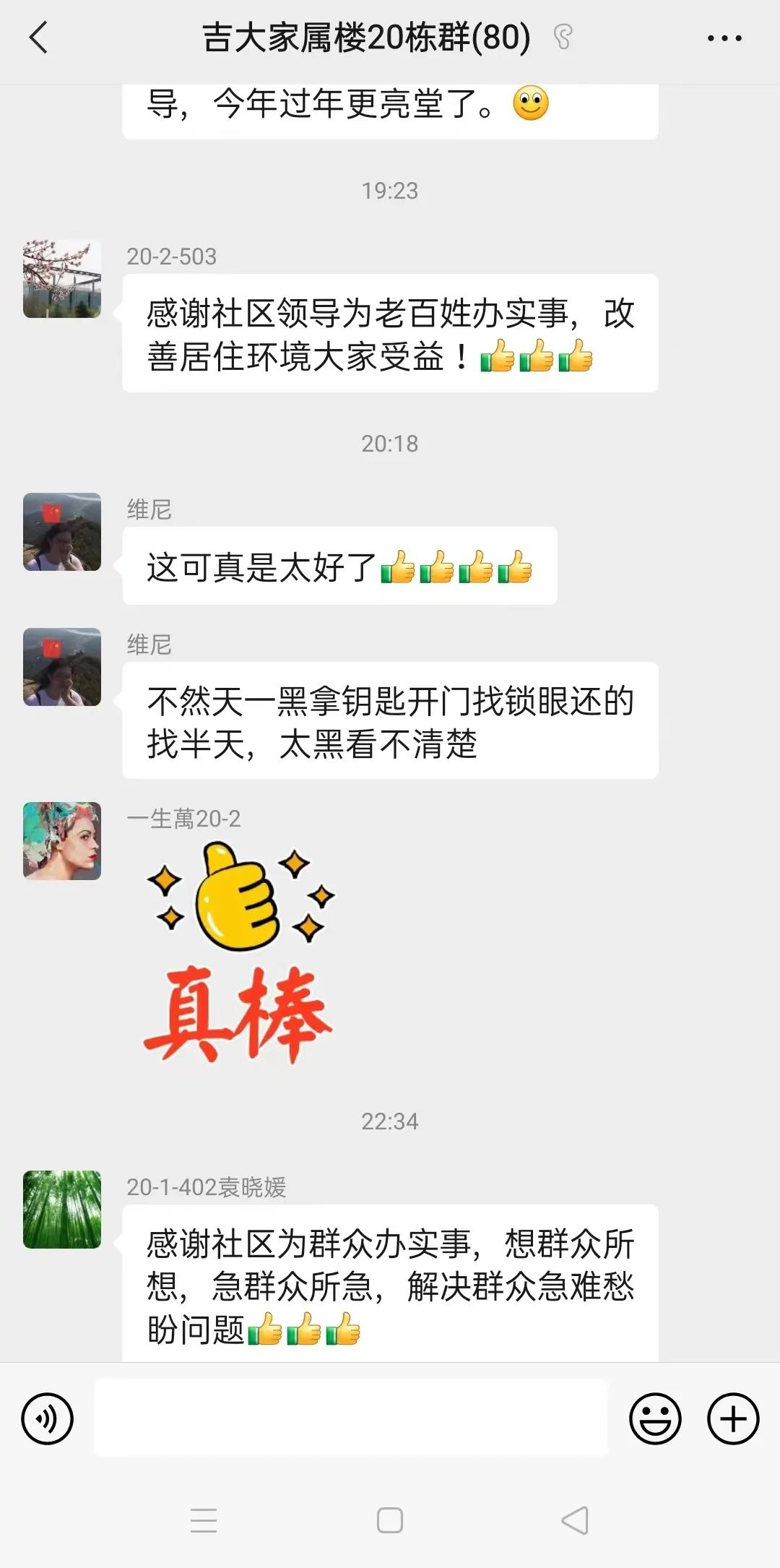 一盏明灯,照亮了一方土地,方便了一方群众,更温暖了一方民心。下一步,吉大社区将立足结对共建模式,深入开展“我为群众办实事”实践活动,解决群众“急难愁盼”问题,齐心协力共绘“幸福小区”美好蓝图。